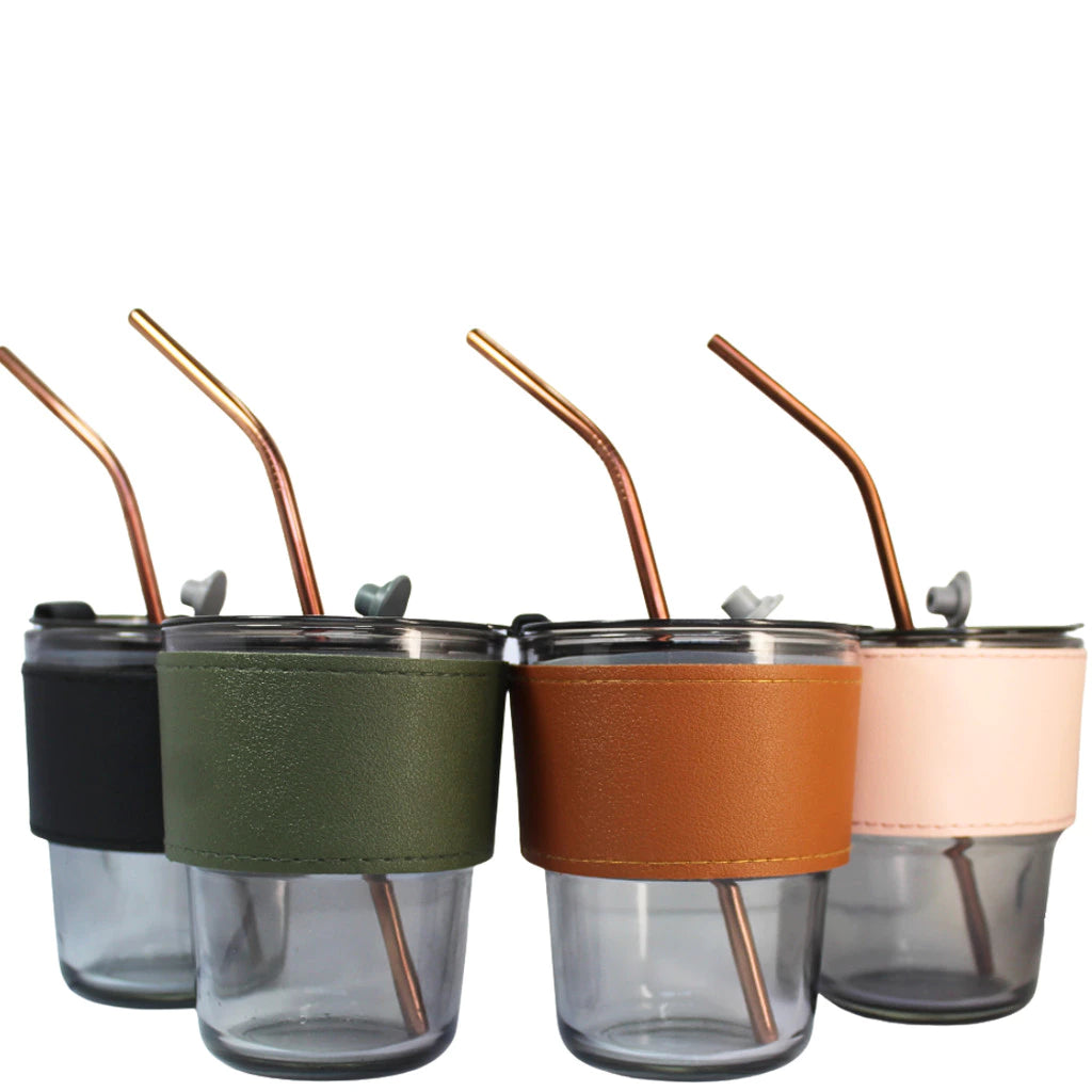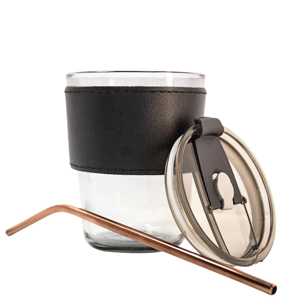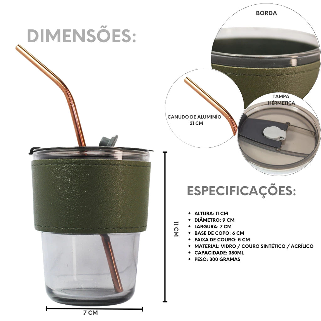 Copo De Vidro Com Canudo E Tampa Hermética 380ml Coldre Couro Moderno