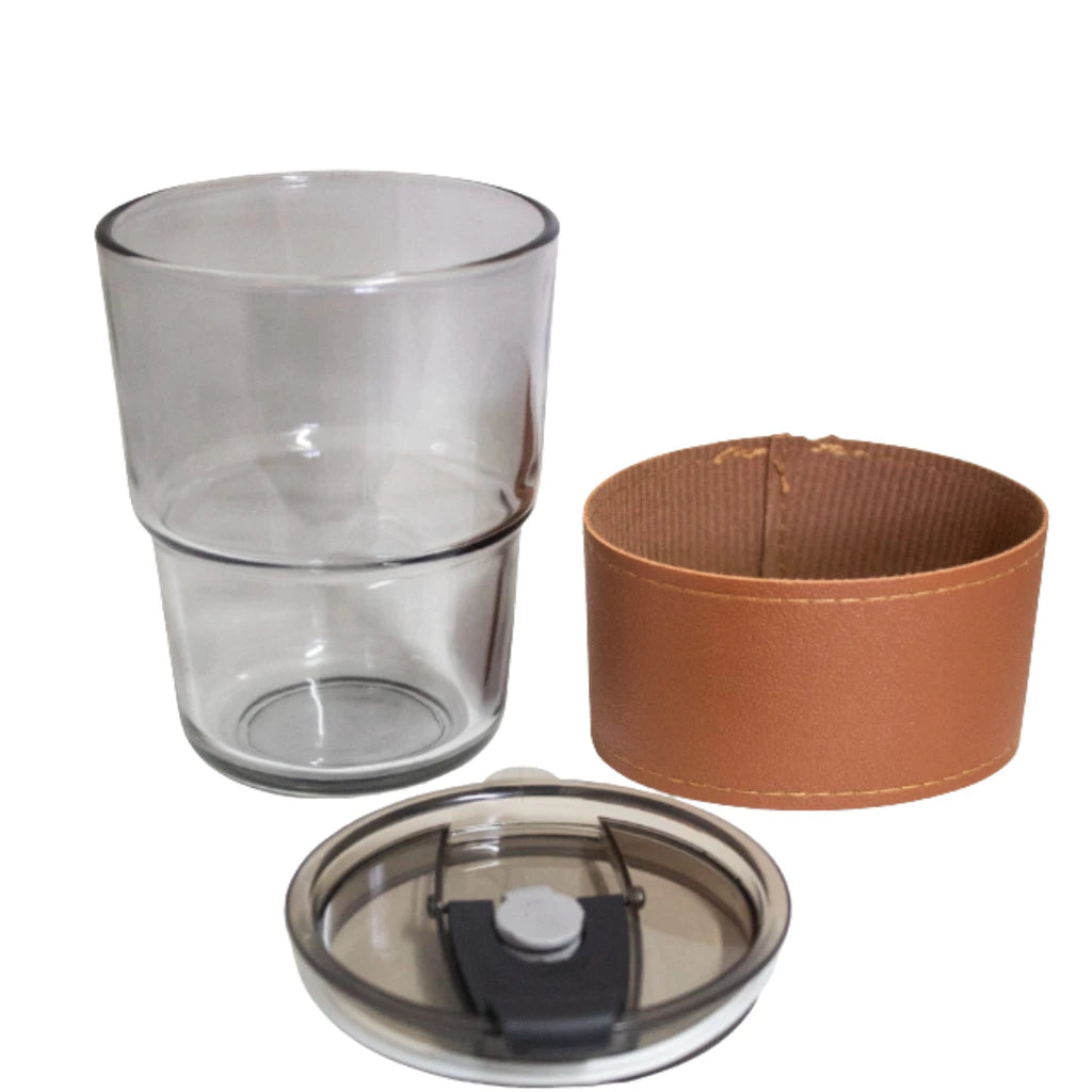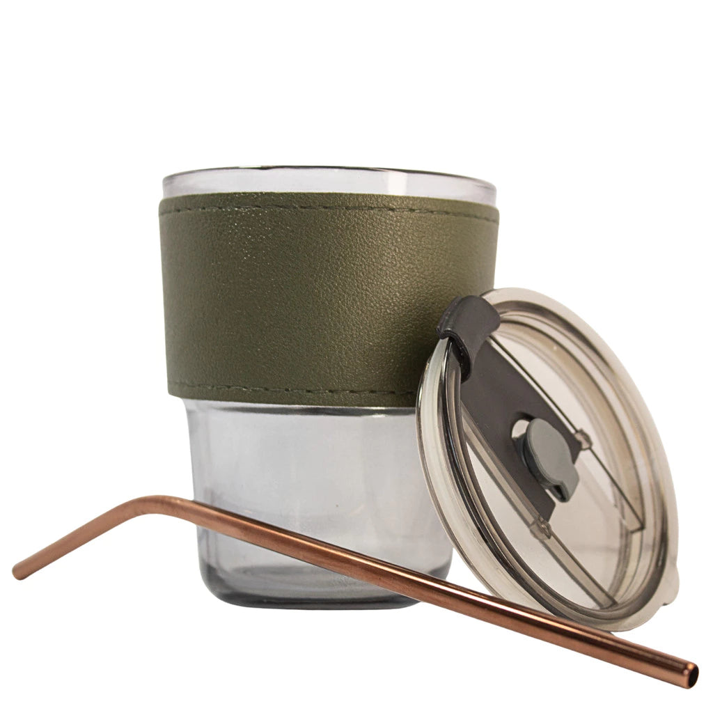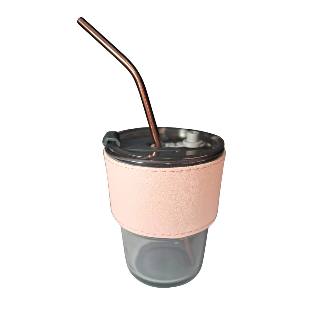 Copo De Vidro Com Canudo E Tampa Hermética 380ml Coldre Couro Moderno